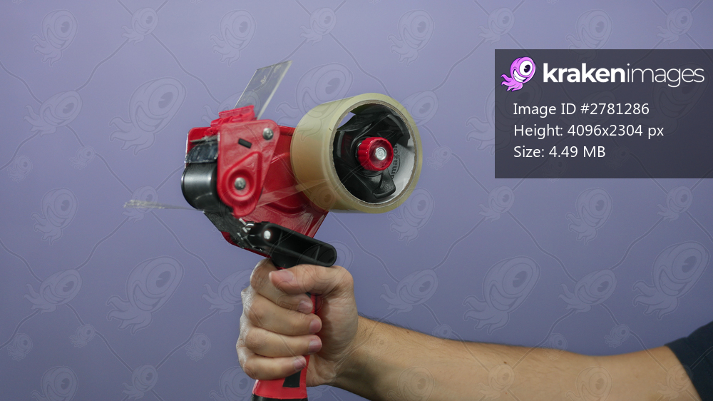 Man holds red tape dispenser against purple wall showing gripping hand with a firm grasp, highlighting packaging with an isolated background in a vibrant and focused scene. - Kraken Images