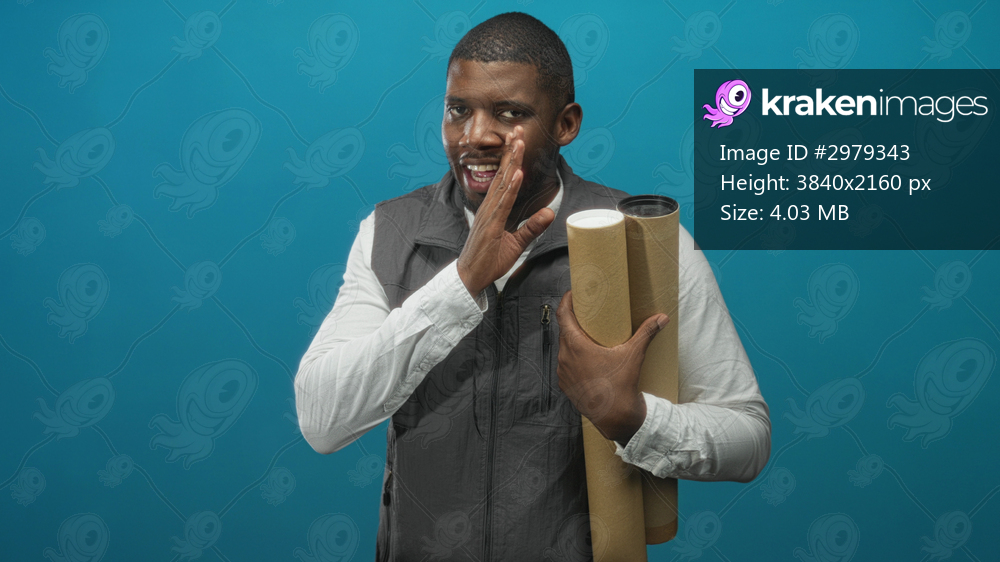 Man holds rolled blueprints under arm while pressing hand to mouth as if whispering in studio; planning determination focus.