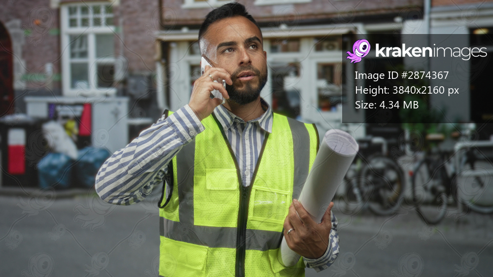 Man holds rolled plans and phone to ear on a busy street, wearing reflective safety vest as engineer; focused planning.