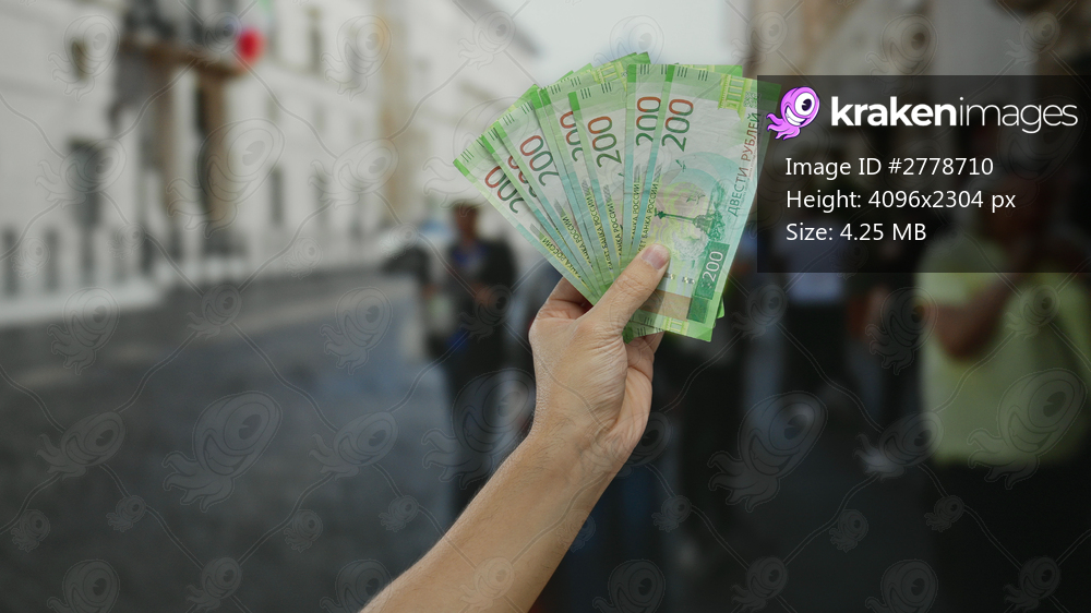 Man holds russian rubles in hand on busy city street with people in background, highlighting financial theme in urban outdoor setting.