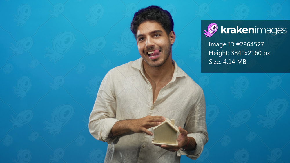 Man holds small wooden house model and sticks tongue out while touching the roof in studio; playful optimism.
