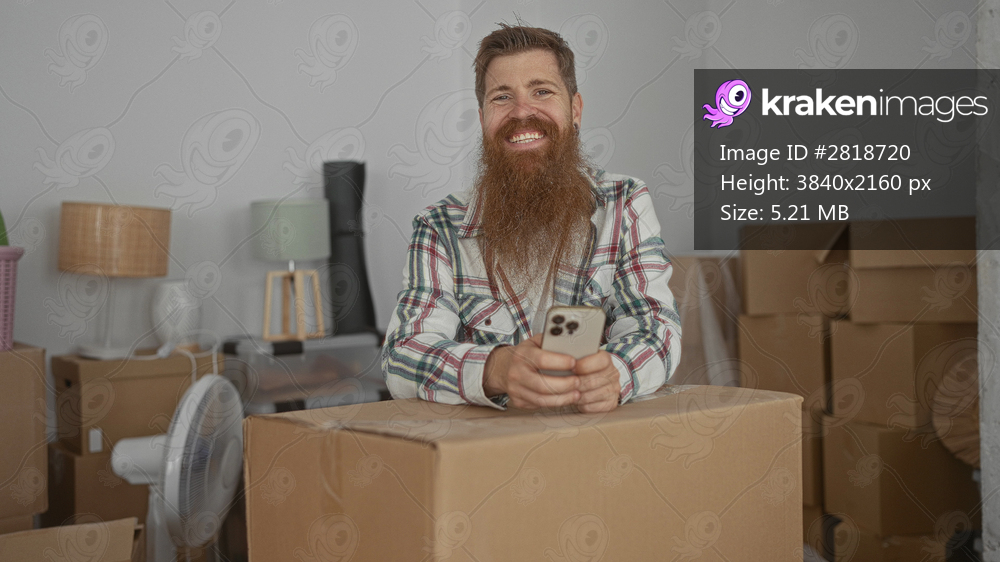 Man holds smartphone in both hands atop a cardboard box in a building under transition with stacked moving cartons and unpacked decor; anticipation.