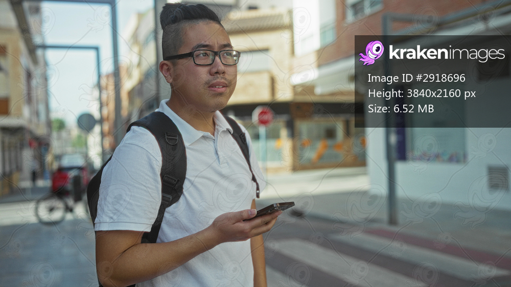 Man holds smartphone in hand and glances toward traffic on a street, wearing backpack and glasses; urban confusion.