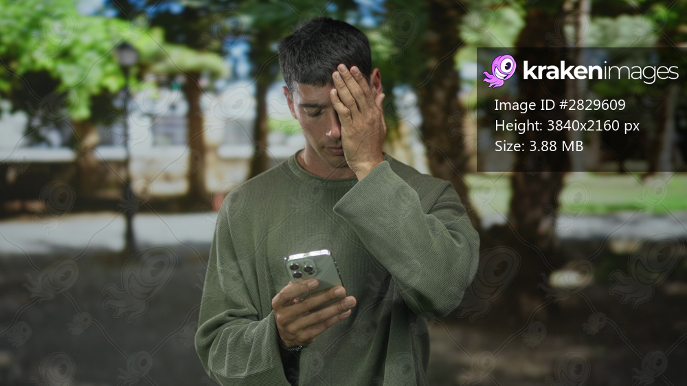 Man holds smartphone in one hand and touches his head with the other while standing amid green trees and walkways in a park; confusion.