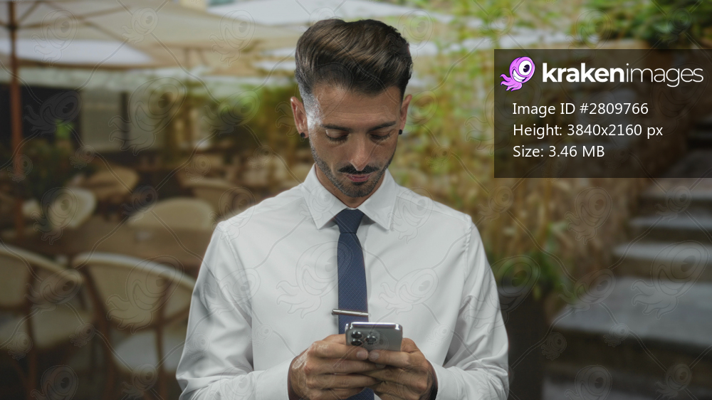 Man holds smartphone in sunlit building terrace outdoors while glancing sideways at the screen; contemplation.