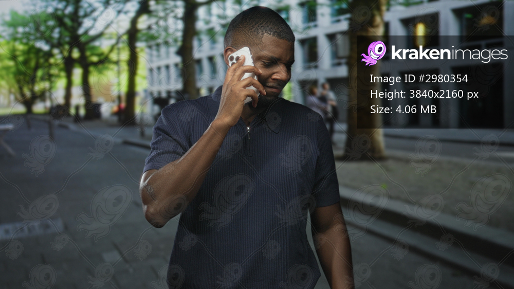 Man holds smartphone to ear with a tense grimace, hand and forearm raised, standing on a city street by building steps and pavement, trees visible; frustration. - Kraken Images