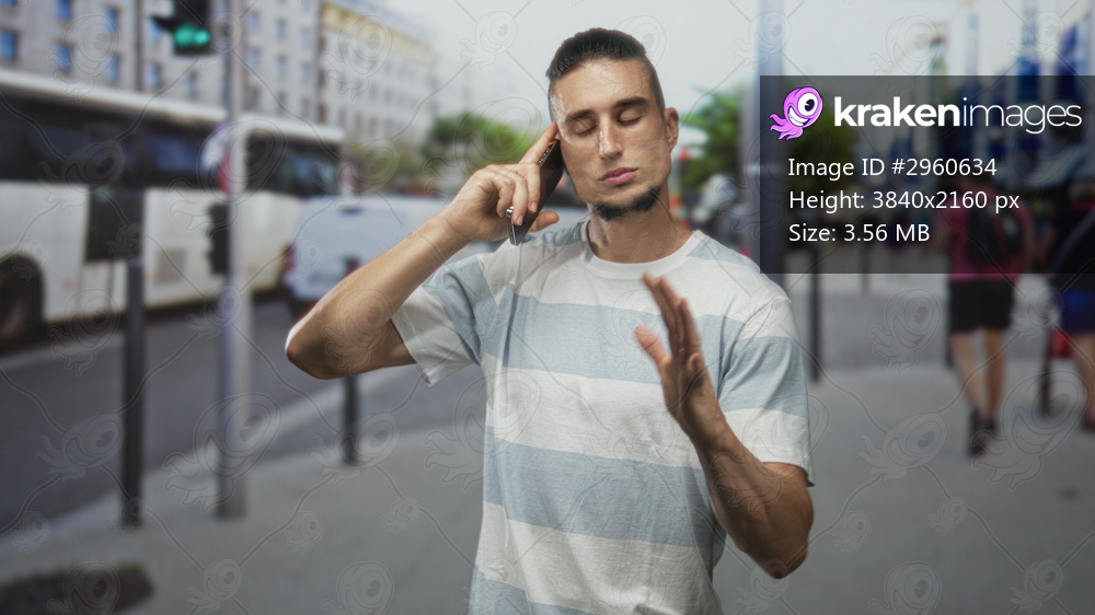 Man holds smartphone to ear and gestures with free hand on a busy street, near buses and poles; concern solitude.