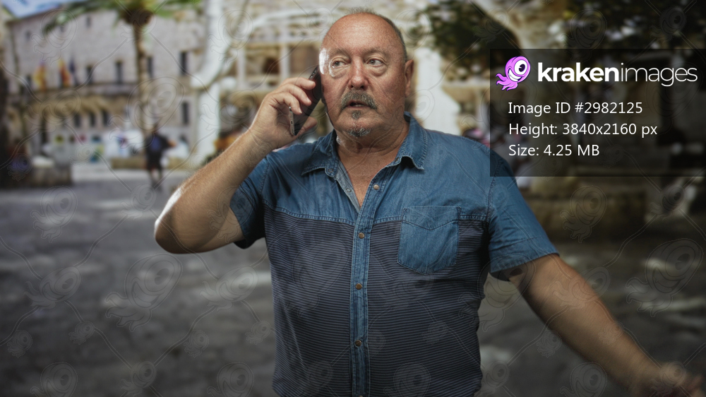 Man holds smartphone to ear, hand at ear, speaking mid conversation and gesturing with free arm while standing on street; concern focus.