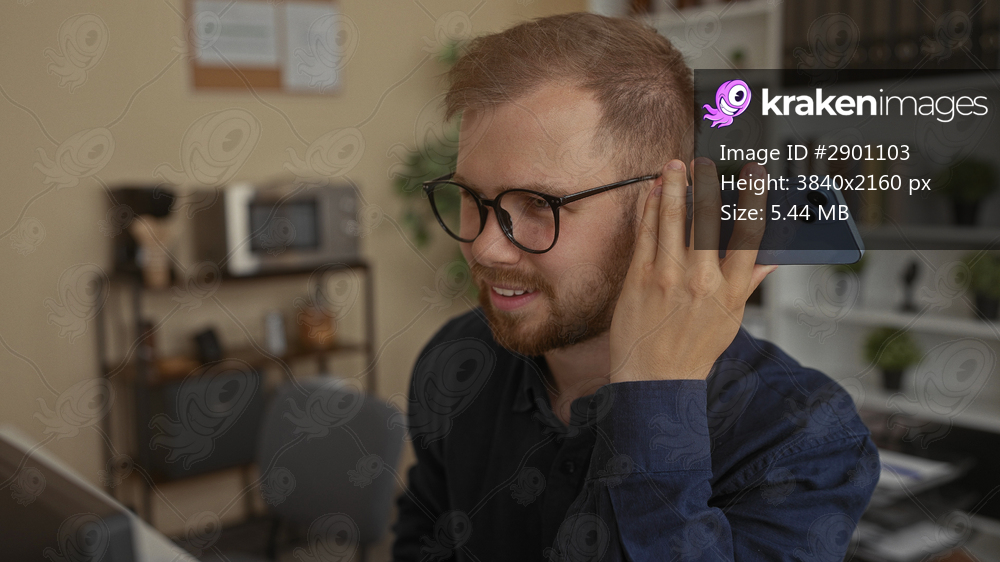 Man holds smartphone to ear with hand and glasses visible in an office building at a desk with bookshelves, monitor and plants; focused.