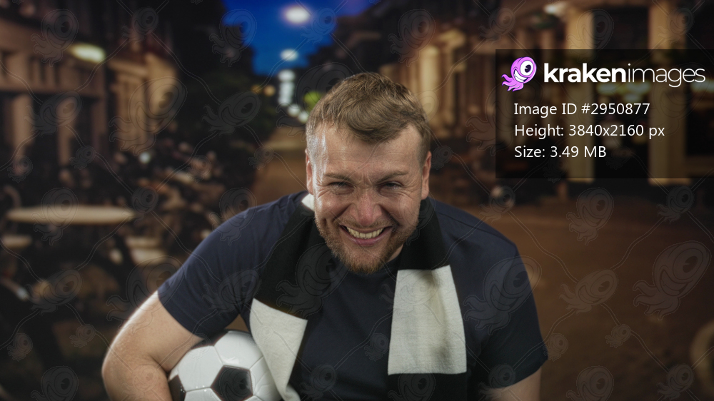 Man holds soccer ball and laughs, hand covering face, wearing black and white scarf in a city street at night; team pride joy.