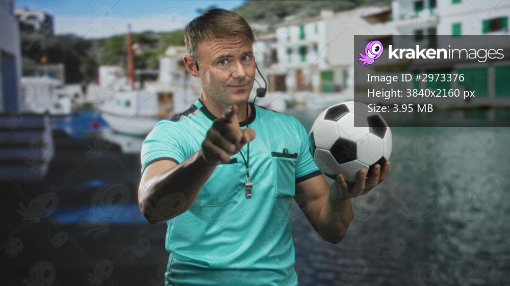 Man holds soccer ball and points finger, bare right hand visible, whistle pendant and headset mic on chest in studio; authority coaching.