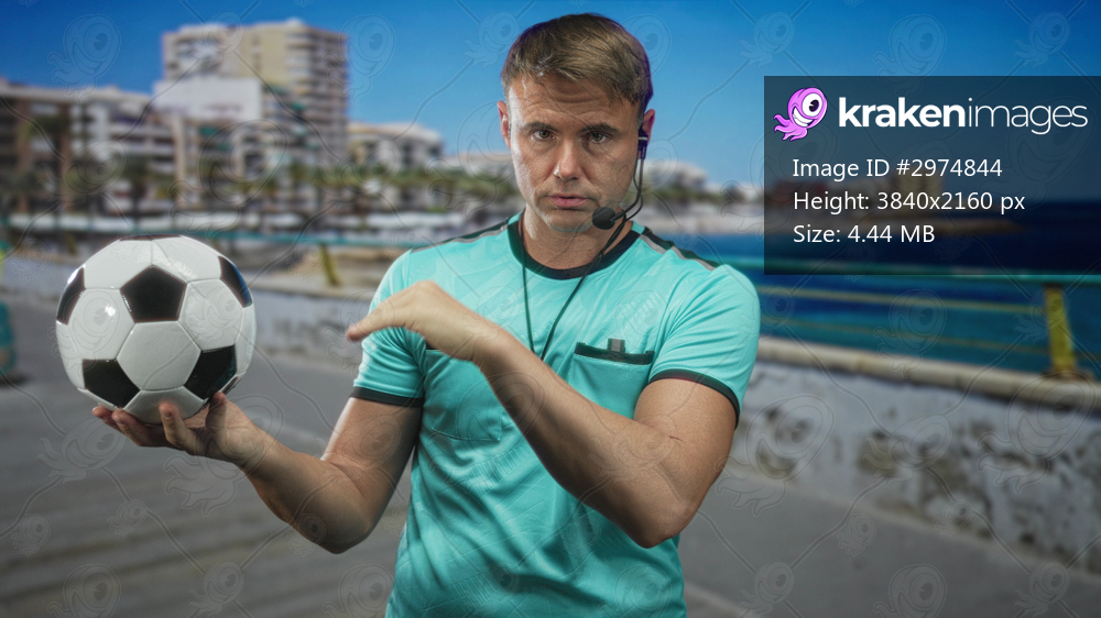 Man holds soccer ball with whistle and headset, palm supporting ball and other hand mid signal while standing on a street with buildings and railing visible; authority confidence. - Kraken Images