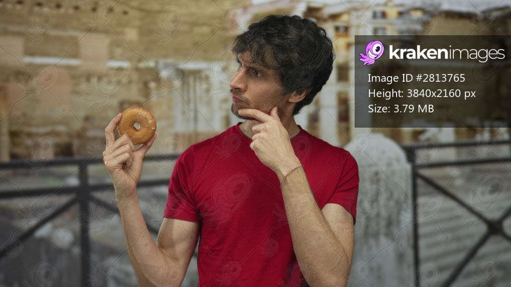 Man holds sunlit golden glazed donut and finger on chin while studying pastry in roman building; curiosity.