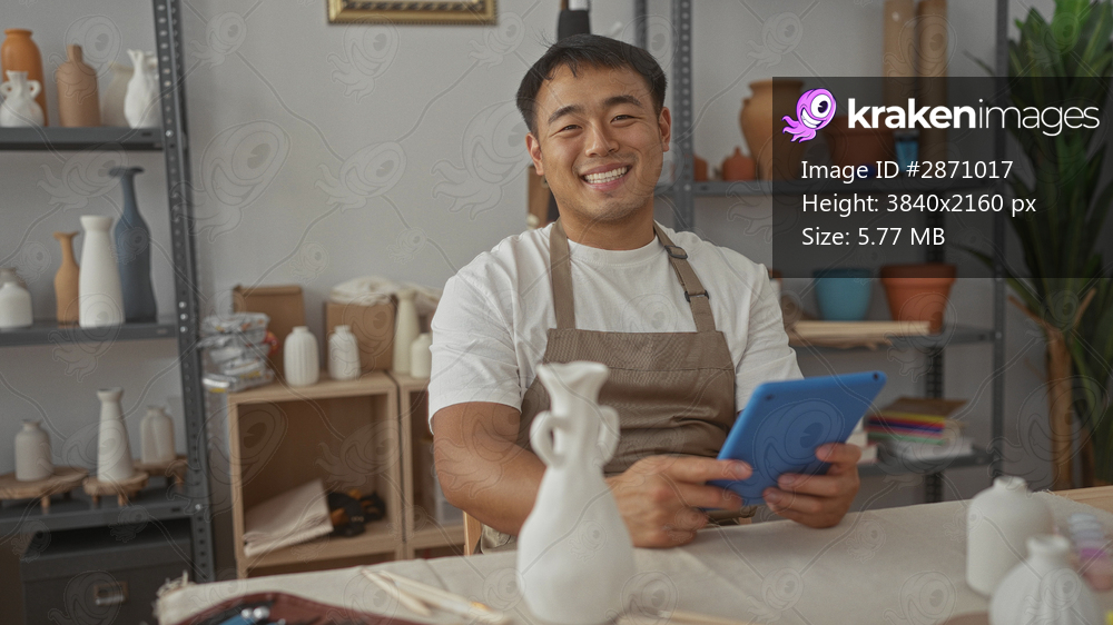 Man holds tablet and taps screen in pottery studio among clay vases and wooden tools on worktable; serenity.