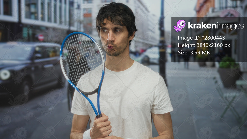 Man holds tennis racket and glances sideways on bustling street with poised stance in white t shirt; focus.