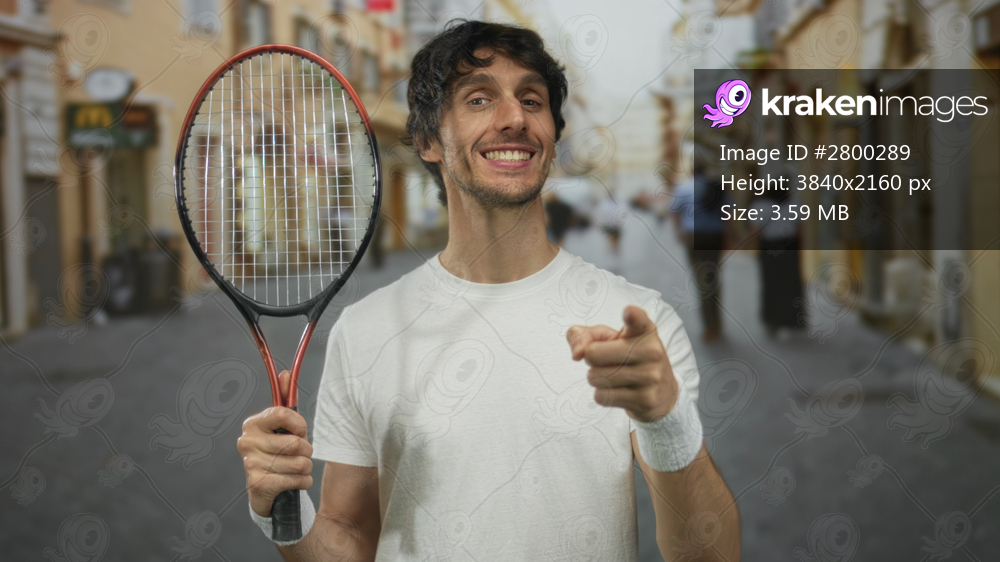 Man holds tennis racket and points finger down a sunlit city street at midday while smiling broadly; confidence.