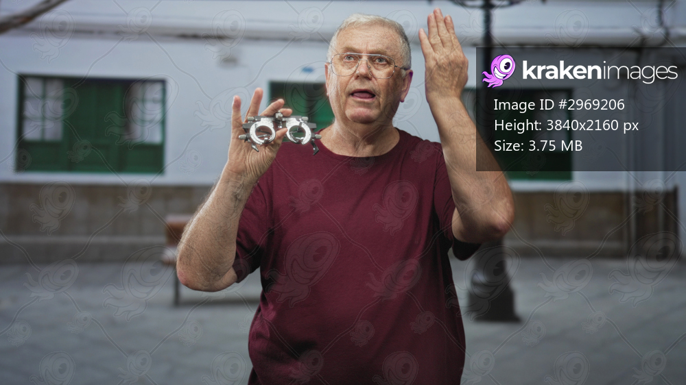 Man holds trial frame with hand and gestures with other palm open during an eye examination outside a building; focused demonstration.