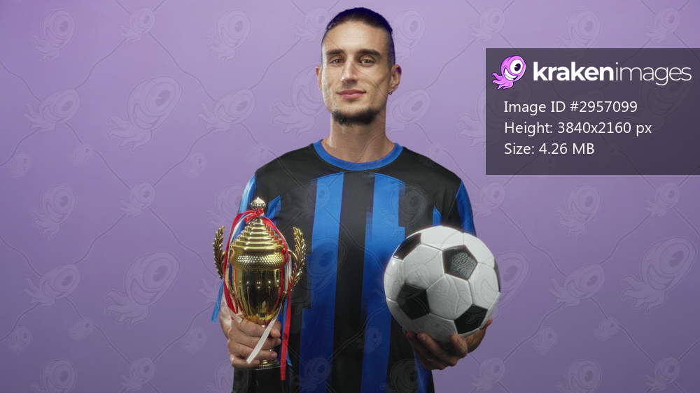 Man holds trophy and soccer ball in studio while wearing blue black jersey and smiling at camera; victory pride.