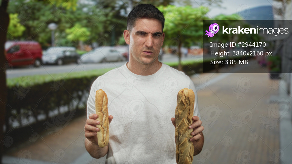 Man holds two baguettes in both hands on city street while grimacing at uneven loaves; disgust dilemma.
