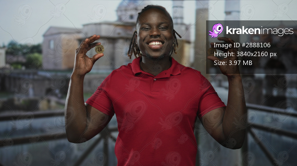 Man holds two bitcoin coins between fingers on a building balcony in old town wearing red polo shirt; wealth confidence.