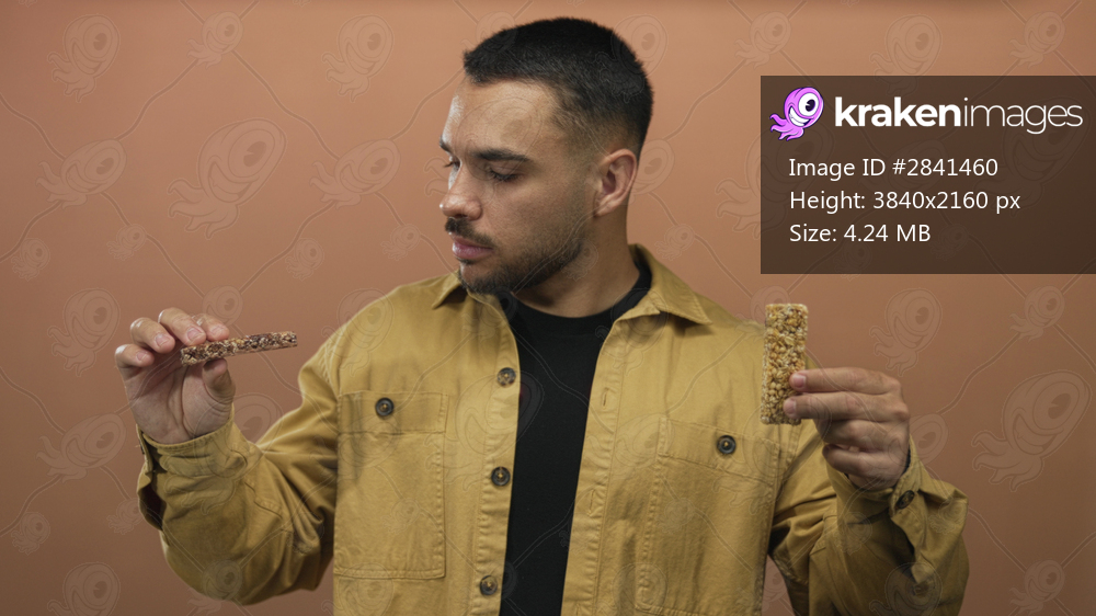 Man holds two granola bars in each hand against a peach wall inside a studio setting; curiosity decision.