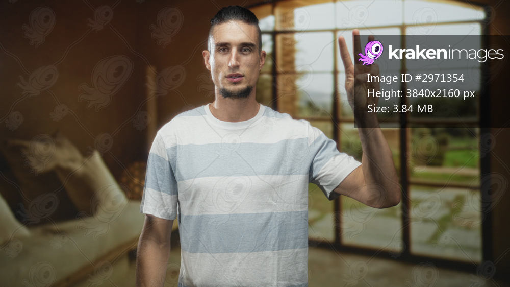 Man holds up five fingers with palm visible, wearing light blue striped tee inside a building with large window and couch; welcoming calm greeting.