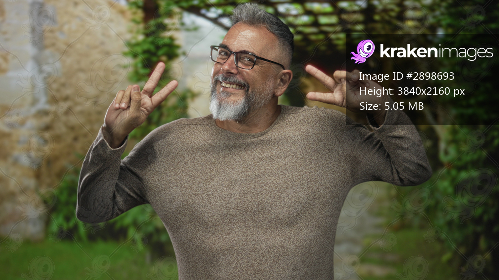 Man holds up peace signs with both hands at a building entrance, smiling and wearing glasses and sweater; playful confidence.