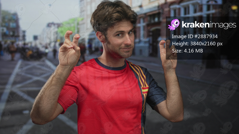 Man holds up peace signs with both hands on a busy city street wearing a red soccer fan jersey and smiling; pride celebration.