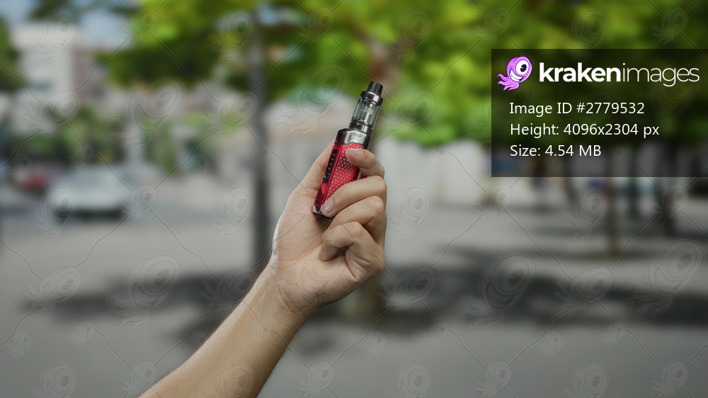 Man holds vape in hand while standing outdoors in a city street with blurred background, showcasing relaxed urban lifestyle.
