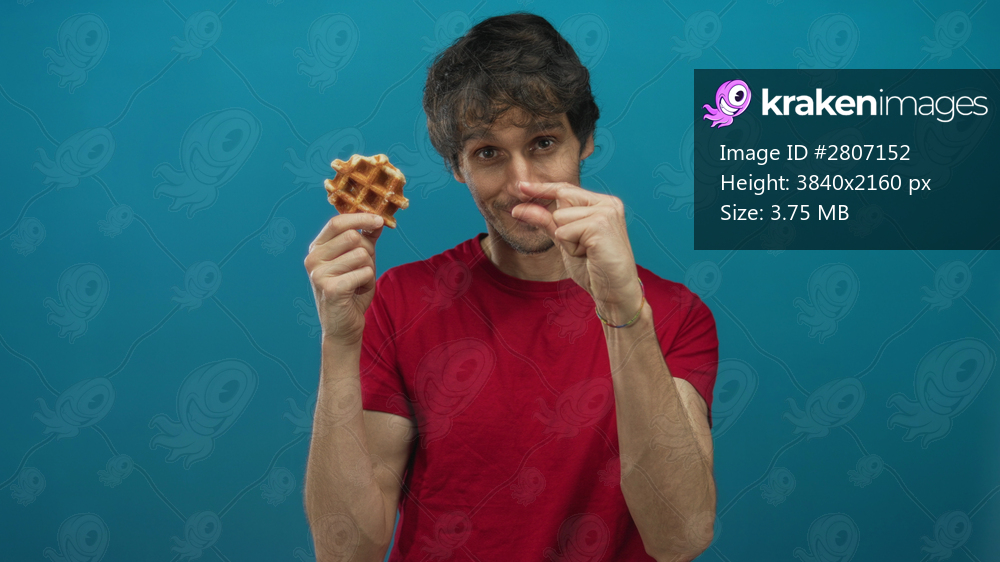 Man holds waffle and pinches a small crumb between fingers in studio against blue wall; snack fun session.