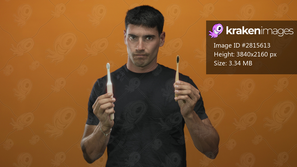 Man holds white electric toothbrush and bamboo toothbrush in modern studio; choice comparison indecision.