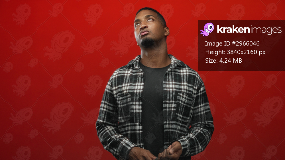 Man holds wrench in studio with visible hand and apathetic facial gesture, plaid shirt against red backdrop; quiet contemplation.