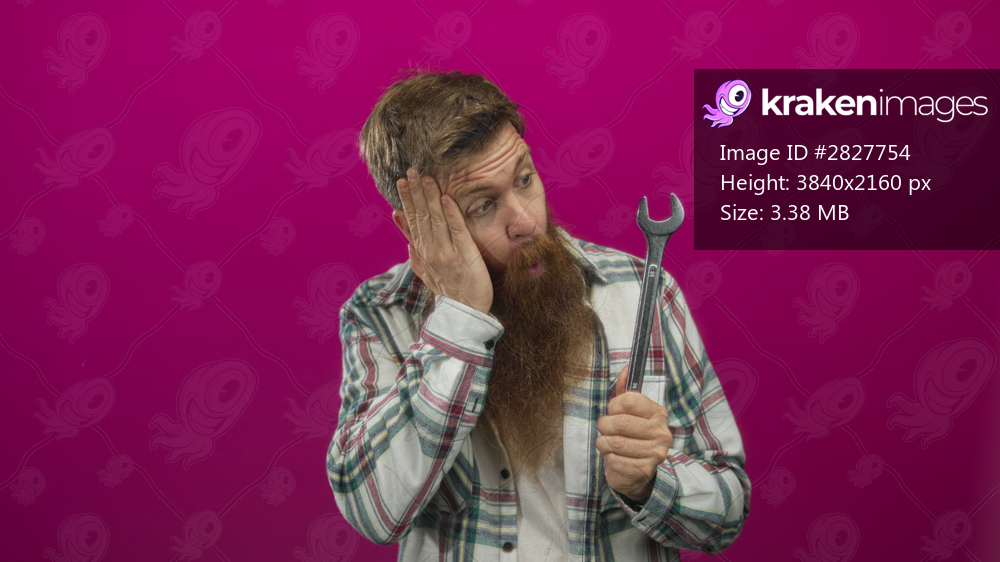 Man holds wrench with open mouth and raises hand to cheek in studio against magenta backdrop; surprise.