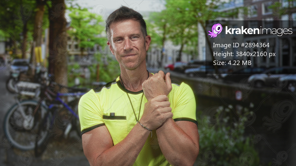 Man holds wrist beside parked bicycles along canal on a street in amsterdam while wearing bright yellow sports shirt and lanyard; determination recovery. - Kraken Images
