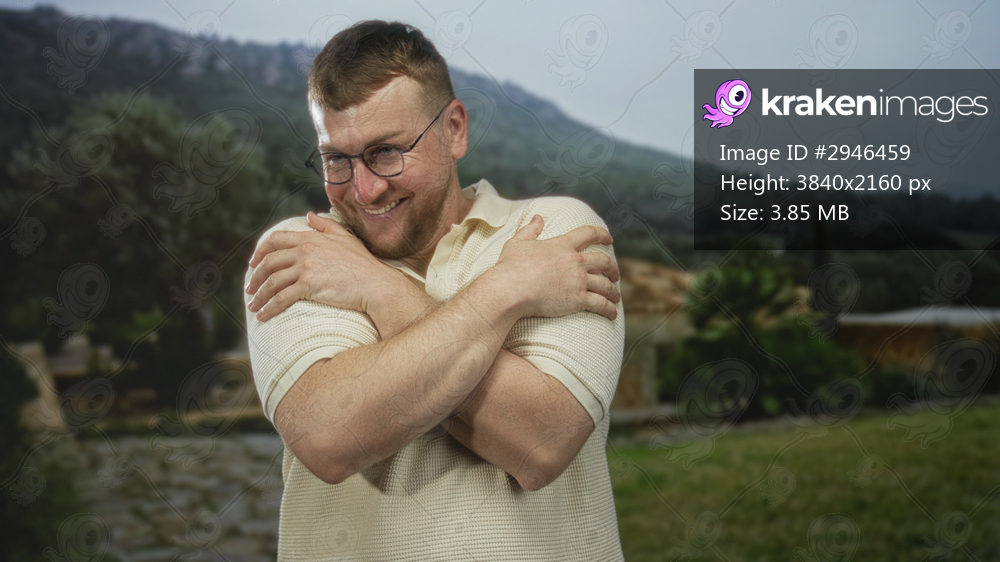 Man hugging his shoulders with arms crossed, smiling, young caucasian wearing glasses in park countryside with stone path and hillside; comfort.