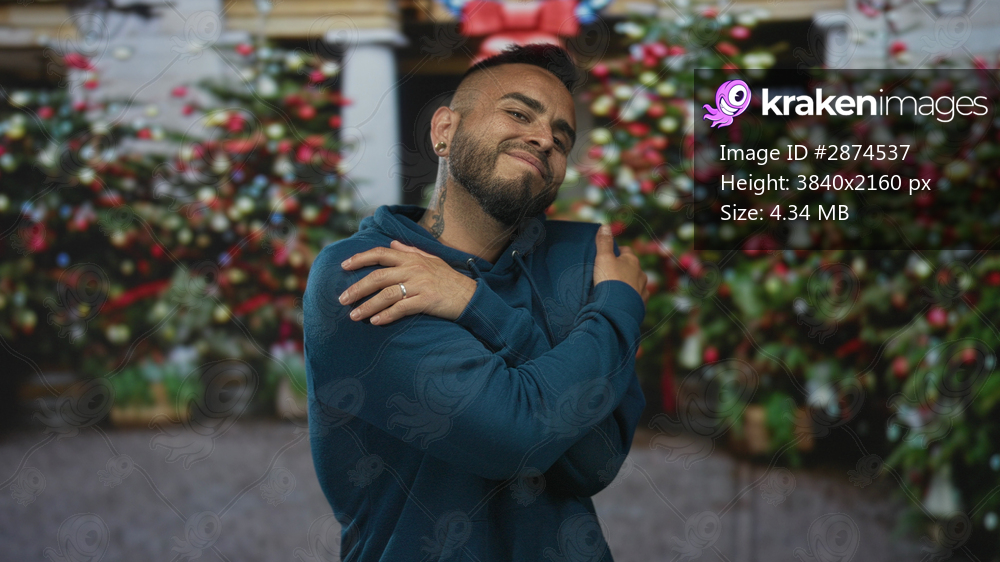 Man hugging his shoulders in front of decorated market plants and lights on street smiling; contentment.