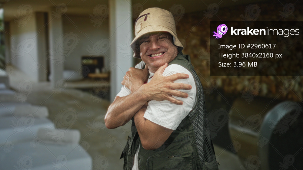 Man hugging shoulders and grimacing in a building pool area while wearing a fishing vest and bucket hat; discomfort solitude.