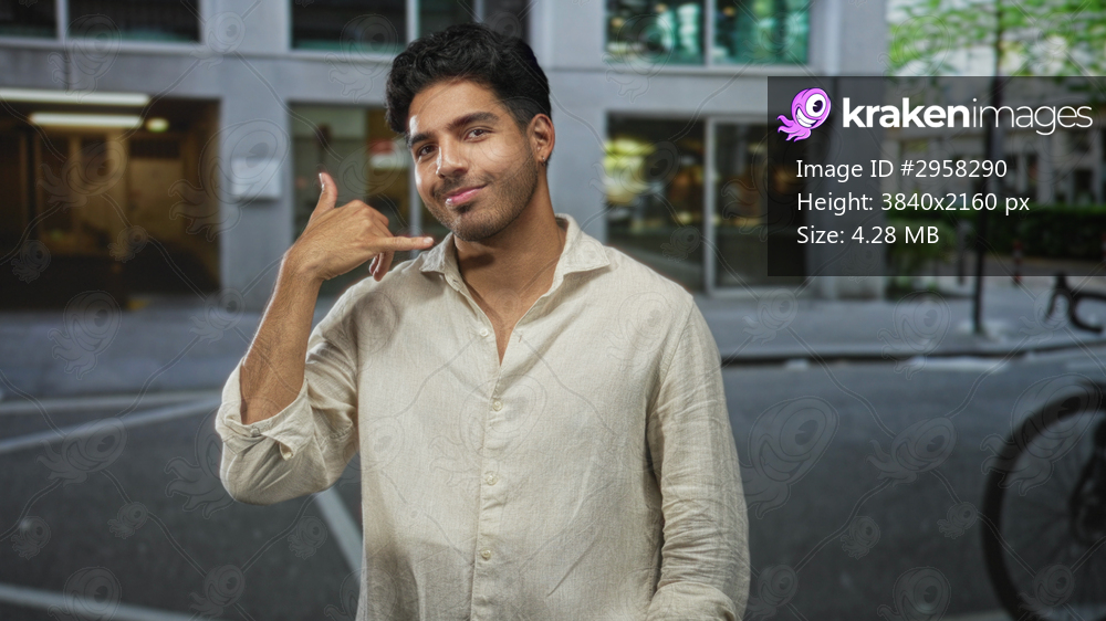 Man in a beige linen shirt makes a phone gesture with his hand and smiles on a city street near a storefront; friendly invitation.