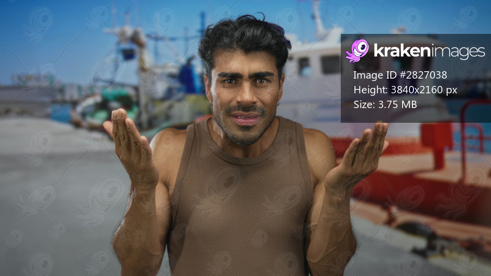 Man in a brown tank top raises both hands beside a fishing boat on a street under clear sunlight; confusion.