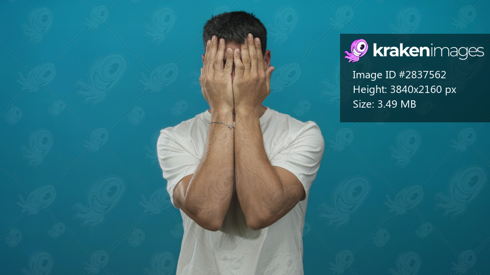 Man in a casual white t-shirt pressing temples with both hands and smiling gently in a bright blue studio setting; relief.