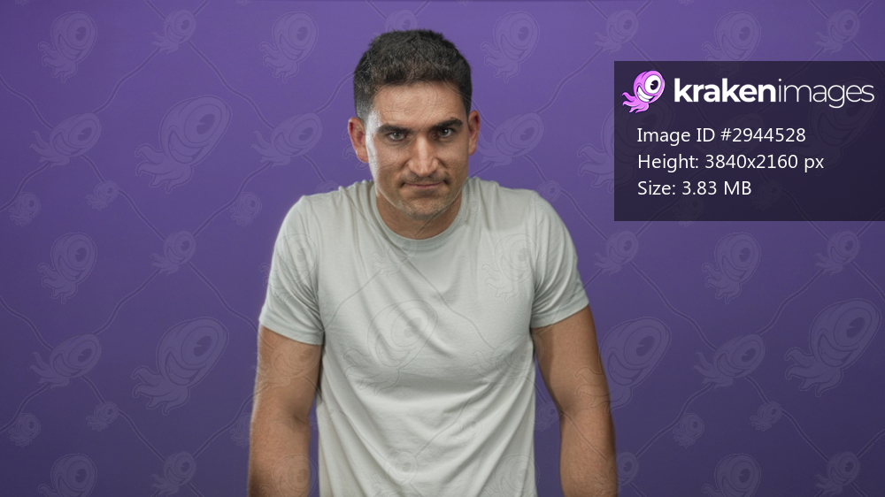 Man in a light gray t shirt leaning forward with a slight smile and direct gaze in a purple studio; thoughtful.
