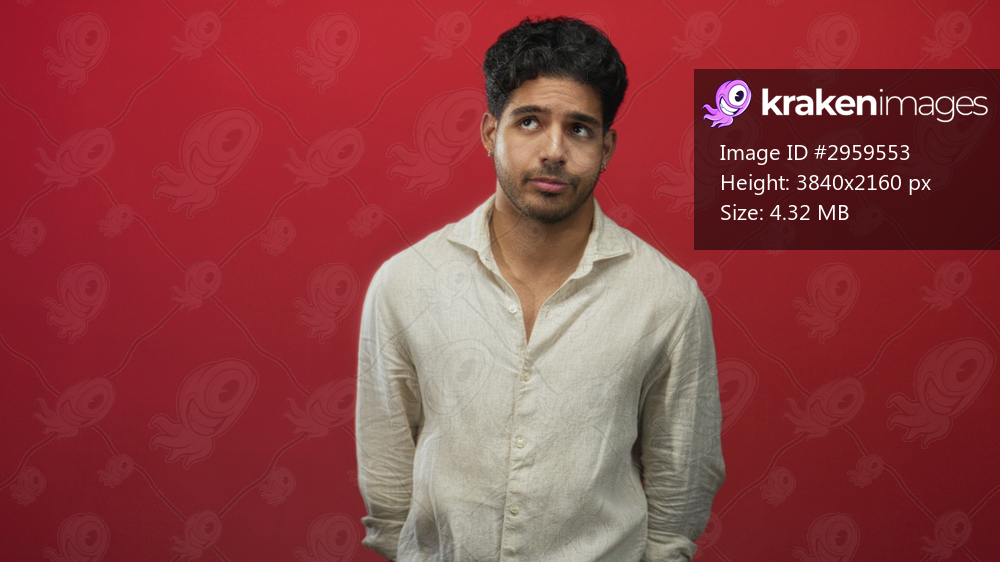 Man in a loose linen shirt standing with hands behind back and neutral expression in studio; uncertainty introspection.