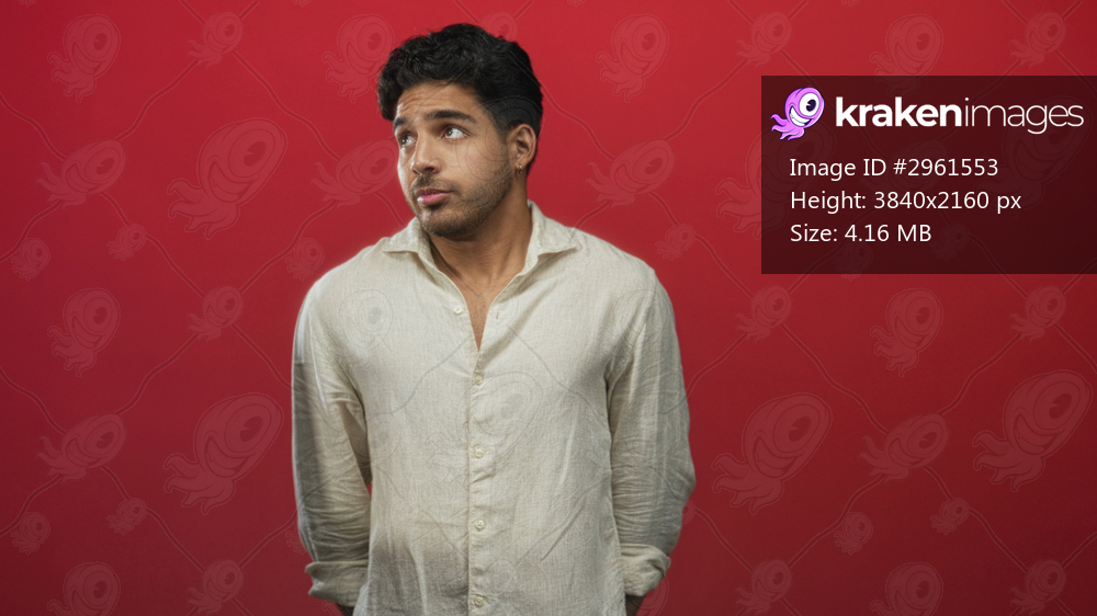 Man in a loose linen shirt standing with hands behind back and neutral expression in studio; uncertainty introspection.