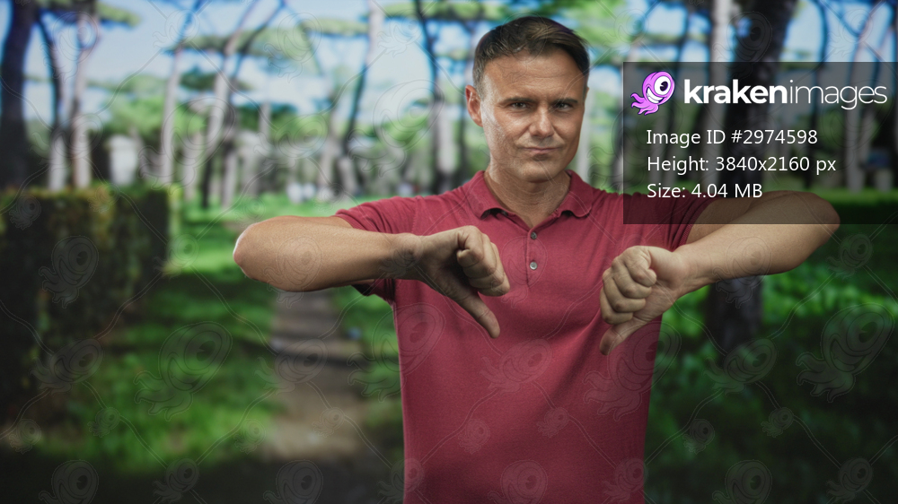Man in a red polo shows two thumbs up and earlier gives thumbs down on a forest path, hands visible and facing camera; confidence approval.