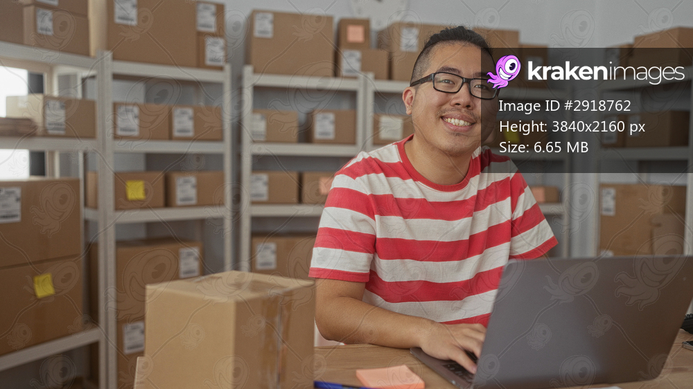 Man in a red striped shirt typing on laptop with parcel at a packing desk with rows of boxes and shelves in a building; small business productivity.