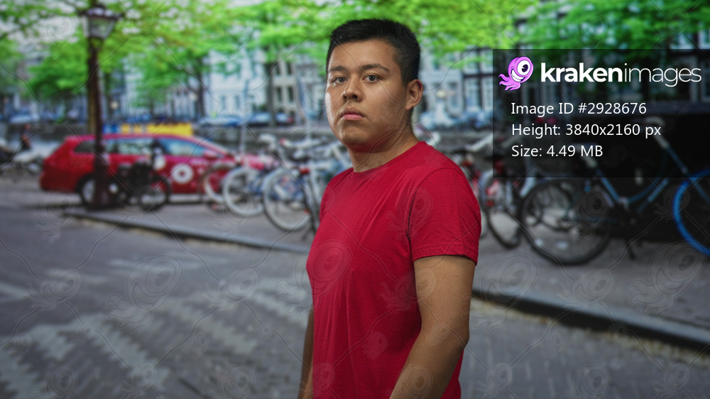 Man in a red t shirt standing and looking at camera on a city street, cobblestone pavement visible; quiet confidence.