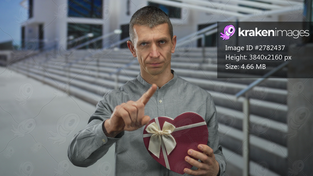 Man in a street holding a heart-shaped gift box, gesturing no with his finger, against a backdrop of outdoor stairs in an urban setting.