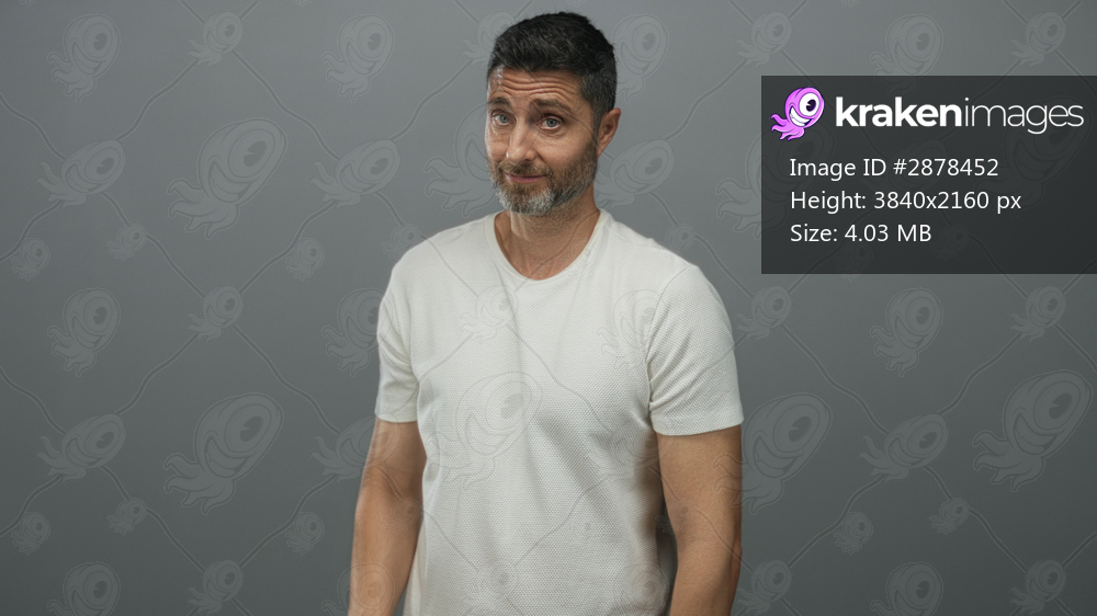Man in a white t shirt with hand covering one eye and visible forearm posed in gray studio; frustration.