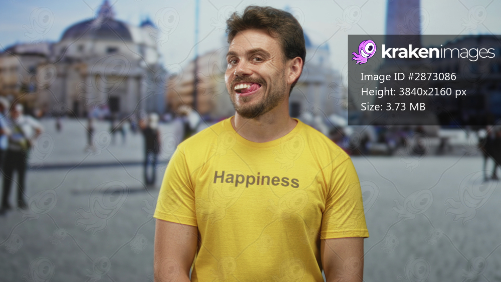 Man in a yellow tshirt sticking out his tongue in front of a historic building in a crowded square; playful mischief.