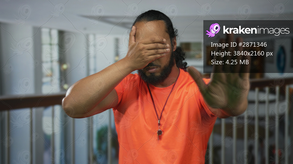 Man in an orange shirt covering his eyes with one hand and holding the other palm out in a hotel building corridor, hands raised in stop gesture; privacy refusal. - Kraken Images